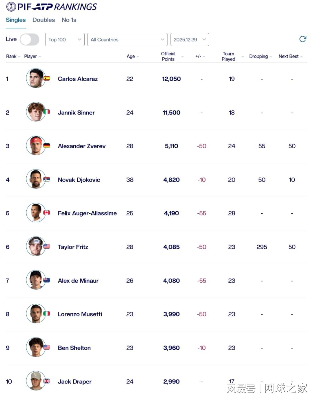 从当前的顶尖球员被扣分情况来看,除了阿尔卡拉斯、辛纳和德雷珀未被扣分之外,前十球员中的七人均因新规受到了不同程度的影响。让人欣慰的是,扣分并未引发前十排名地震,所有前十球员的位次并未因此发生改变。