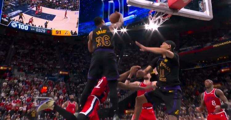 更黑的哨子还在后面,在湖人队把分差追到还剩9分的时候,他们底角三分不中,去抢前场篮板时,斯玛特整个人撑杆跳,用左胳膊狠狠的一肘压在了快船球员乔丹米勒的脖子上。用肘压着别人的脖子,撑杆跳抢前场篮板,这球竟然吹了快船犯规?